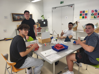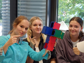 Nach der Ankunft in Karlsruhe wurden die Klassen aufgeteilt und jeweils eine besuchte den Workshop zur vierten Dimension und die andere das Mathe-Schülerlabor. Im Workshop bekamen wir eine Einführung in die verschiedenen Dimensionen, welche uns anhand eines Würfels und Figuren erklärt wurden. Zuerst haben wir uns mit den schon bekannten Dimensionen beschäftigt und auch ein Übungsblatt dazu ausgefüllt. Anschließend haben wir versucht, ein Netz eines vierdimensionalen Würfels zu konstruieren, was den meisten Gruppen auch gelungen ist. Wir konnten viel diskutieren und ausprobieren, weshalb der eineinhalb-Stunden-lange Workshop schneller vorbei ging als so manche Mathestunde.