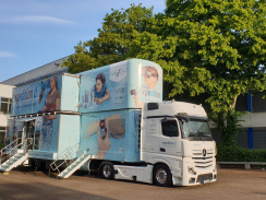 Dieses Fahrzeug ist schwer zu übersehen – 16,50m lang, 7,50m breit und 6,20m hoch ist der imposante Truck, der vergangene Woche drei Tage lang im Schulhof des Einstein-Gymnasiums geparkt hatte. In seinem Inneren erwartete die Schüler*innen der 9. bis 12. Klasse die „expedition d“: 15 Zukunftstechnologien konnten in einer zweistöckigen Hightech-Erlebniswelt erkundet werden. Zahllose Exponate und eine riesige Multimedia-Wand bildeten dabei die Grundlage für die verschiedenen Stationen der mobilen interaktiven Ausstellung. Bei der Bildungsinitiative „expedition d“ dreht sich alles um die Digitalisierung: Wie verändert sie die Arbeitswelt? Welche neuen Berufsfelder entstehen? Und welche Kompetenzen werden künftig für diese digitalen Technologien benötigt?