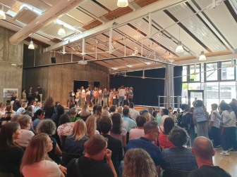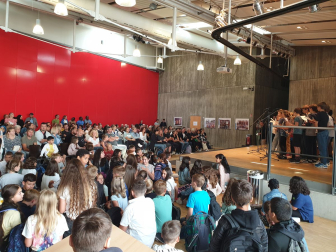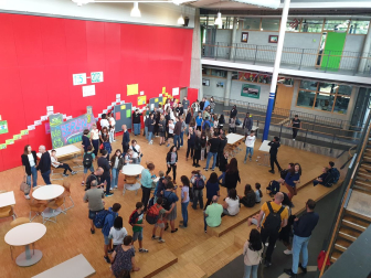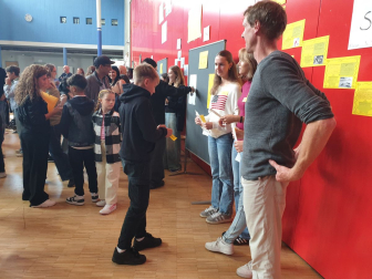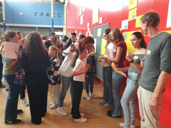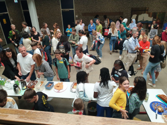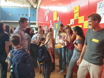 Am Nachmittag des Empfangs erhielten die Eltern zudem durch die Schulleitung weitere wichtige Informationen, z.B. über die Schul-App Sdui, die die Kommunikation und Einsicht in den Stundenplan, die Hausaufgaben und weitere Funktionen ermöglicht. Die Vorsitzende des Elternbeirats Nadja Hörterer und der Vorsitzende des Fördervereins Thomas Krieg warben um die Unterstützung und Mitarbeit der Eltern im „Einstein“. Schließlich konnten die Eltern wie in jedem Jahr das beliebte „Starterpaket“ der SOS-AG kaufen, das in Abstimmung mit den einzelnen Fächern bereits die wichtigsten Schulmaterialien enthält. Für das leibliche Wohl war beim Ausklang im Musikatrium der Schule ebenfalls gesorgt, wo alle Schüler*innen, Gäste und Mitglieder der Schulgemeinschaft bei heiteren und angeregten Gesprächen wieder zusammentrafen.