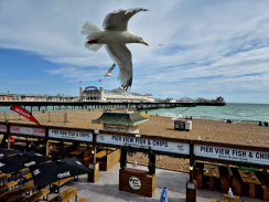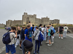 Am vorletzten Tag zeigte sich der Badeort Brighton von seiner schönsten Seite. Warmes Sommerwetter, glitzernde See und angriffslustige Möwen begleiteten die „Einstein“-Gruppe den Tag über. Gemeinsam flanierten die Schüler:innen die Promenade von „Brighton Beach“ entlang und besuchten später den an einen indischen Mogulpalast erinnernden „Royal Pavillon“. In der Freizeit stellte natürlich auch der berühmte „Brighton Pier“ mit seinen Vergnügungsattraktionen einen Anziehungspunkt dar, aber manche Gruppe fand auch ihren Weg zu den vielen kleinen Kunst- und Trödelgeschäften im „North Laine Bazar“. Nach dem Abschied von den Gastfamilien stand schließlich die Küstenstadt Dover am letzten Tag im Mittelpunkt. Zwischen den Mauern, auf den Zinnen und im Untergrund von Dover Castle gab es mittelalterliches Leben und Kriegskunst zum Anfassen. Nur die schlechte Sicht und tief vorbeiziehende Wolken konnten den Willen der „Einstein“-Gruppe danach noch brechen, auf eine Küstenwanderung zu starten. Stattdessen versorgte man sich mit genug Proviant, um die lange Rückreise mit Bus und Fähre bis zur Grenzkontrolle an der Europabrücke anzutreten. Ermöglicht und organisiert wurde die Fahrt wie im vergangenen Jahr von den „Einstein“-Lehrkräften Patricia Knoll und Julian Wussler.