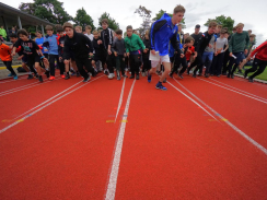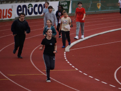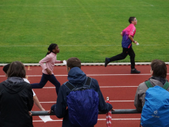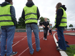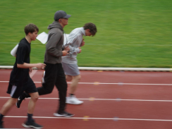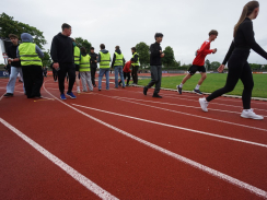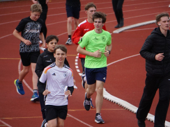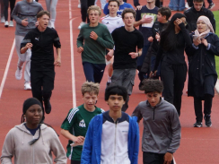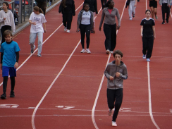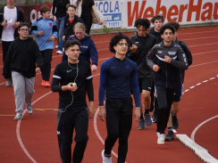 Am Tag des Spendenlaufs war dann das Wetter kurze Zeit eher zum Davonlaufen – weder Wolken noch ein Regenschauer konnten die Teilnehmer:innen allerdings stoppen. Der erste Startschuss fiel um halb neun für die 5. bis 7. Klassen, die eifrig loslegten. Manche Läufer:innen hatten als zusätzlichen Ansporn auch weitere Prämien im Blick: Immerhin sollte die Klasse, die am meisten Kilometer gelaufen war, einen Sonderpreis erhalten. Die Klasse 7d errang ihn mit 619 absolvierten Runden. Zusätzlich gelangten alle Teilnehmer:innen, die 20 Runden (also 6km) schafften, in einen Lostopf mit weiteren gesponserten Gewinnen. Um sie zu ermitteln, warteten nach jeder Runde Helfer:innen, die auf den Startnummern den Lauf dokumentierten.