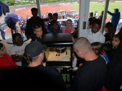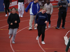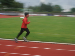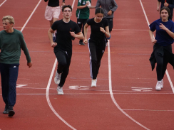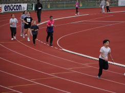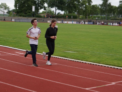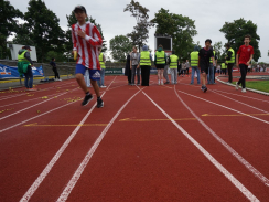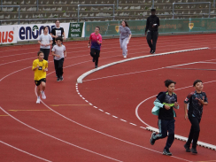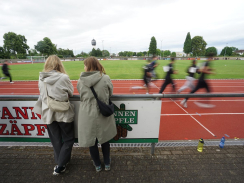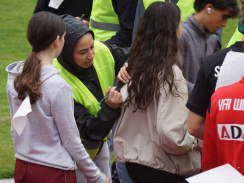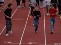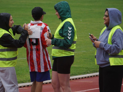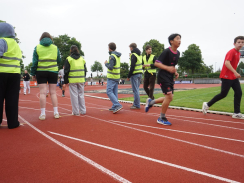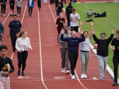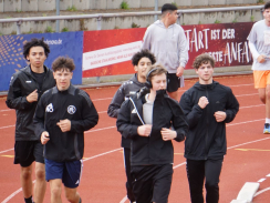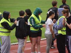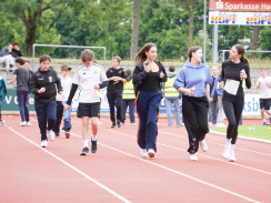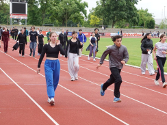 Kurz nach 10 Uhr kam es dann zum Schichtwechsel im Stadion: Die älteren Schülerjahrgänge nahmen die Bahnen im Rheinstadion ein und die jüngeren Schüler:innen wechselten auf den benachbarten Kunstrasen und die Trainingsfelder. Dort war an sechs Stationen nun die Teamfähigkeit gefragt, z.B. beim Kleinfeldfußball, Eierlauf oder Wassertransport. Für viel Begeisterung sorgte auch die Tauziehstation der Sportfreunde Goldscheuer, bei der zahllose Schüler:innen und Klassen ihre Kräfte messen wollten. Pünktlich zur Mittagsstunde versammelten sich dann sämtliche Teilnehmer:innen auf der Haupttribüne für das große Abschiedsfoto und zum Rückblick auf einen Schultag, der vielen in schöner Erinnerung bleiben wird. Die Gesamtzahl der gelaufenen Runden betrug übrigens 9.303, also umgerechnet mehr als 3721 km Strecke.