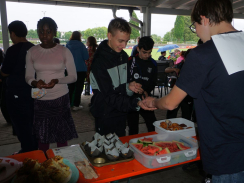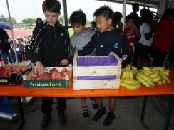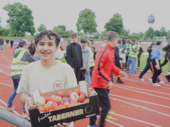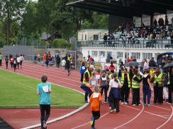 Zur tollen Atmosphäre im Stadion trugen viele weitere Helfer:innen, AGs, Lehrer:innen, Eltern, Ehrenamtliche und weitere Sponsor:innen bei. Die Technik-AG hielt die Stimmung der Läufer:innen mit der passenden Musik hoch, die Schulsanitäter-AG stand für gestrauchelte und erschöpfte Schüler:innen bereit (unterstützt vom DRK Linx) und im Rechenzentrum wurden alle Runden addiert. Auch das leibliche Wohl war garantiert: Azubis der BSW versorgten die Anwesenden mit Popcorn, ein großzügiges Obstangebot sowie ein Getränke- und Kuchenstand standen ebenfalls dank zahlreicher Spenden zur Verfügung, sowohl durch Gaben aus der Schulgemeinschaft als auch von einzelnen Unternehmen (Fruchthandel Ulmer, REWE Klauser, Aldi Süd Filiale Kehl-Sundheim, Kaufland Filiale Kehl Sundheim, Getränke Roth).