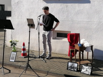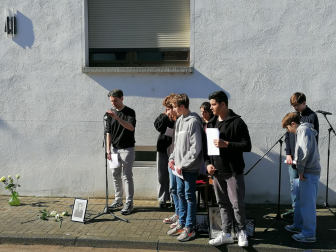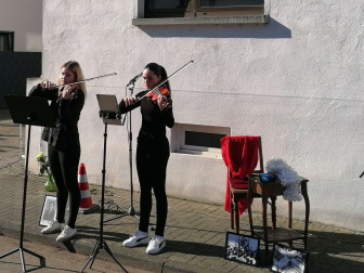 Musikalisch würdig umrahmt wurde die Veranstaltung von „Einstein“-Schülerin Lena Stalinski und der ehemaligen „Einsteinerin“ Lea Balzar auf der Geige. Nachdem ein Mitarbeiter des Betriebshofs die Stolpersteine in den Gehweg eingelassen hatte, legten die Schülerinnen und Schüler weiße Rosen neben den kleinen Tafeln aus Messing nieder, die die Lebensdaten der Ermordeten festhalten. Stolpersteine, in Kehl sind es mittlerweile 73 an der Zahl, werden vor den letzten freigewählten Wohnadressen der Opfer des Nationalsozialismus verlegt.
