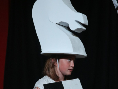 Die Farbe Weiß spielt im Stück eine große Rolle, da die Figuren alle im „Reich der Weißen“ angesiedelt waren. Im realen Schachspiel sind alle Figuren weiß, die Bühnensituation forderte jedoch mehr optische Differenzierung, damit die ZuschauerInnen die Akteure besser unterscheiden konnten. Für die gestaltenden SchülerInnen bedeutete dies, sich vom Vorbild realer Schachfiguren zu lösen und bühnenbildtaugliche Lösungen zu finden. Sie wurden mit schwarzen bzw. weißen Konturen und Akzenten ausgestattet. Läufer, Pferde und Türme erhielten zudem Schilde, die mit unterschiedlichen Schachbrettmustervariationen versehen wurden. Als hilfreich erwies sich eine improvisierte schwarze Wand aus Tonkarton, vor der die Hüte auf ihre optische Fernwirkung hin überprüft wurden. Es stellte sich heraus, dass silber verzinkter Draht (König: Idee Ines Kurtovic) und auch die aufwendig gestalteten Scherenschnittstreifen (Königin, Idee: Luca Szedresi) vom schwarzen Hintergrund geschluckt wurden. Mit weißer Farbe bzw. schwarzem Tonstreifen wurden die Kronen in den letzten Stunden vor der Aufführung verändert. Wer genau hinschaut bei den Fotos, wird entdecken, wie intensiv alle Hüte zwischen Generalprobe und Aufführung überarbeitet worden sind. An dieser Stelle ein herzliches Dankeschön an alle Lehrkräfte, die die SchülerInnen kurzfristig von ihrem Unterricht für die Überarbeitung der Hüte freigestellt haben.